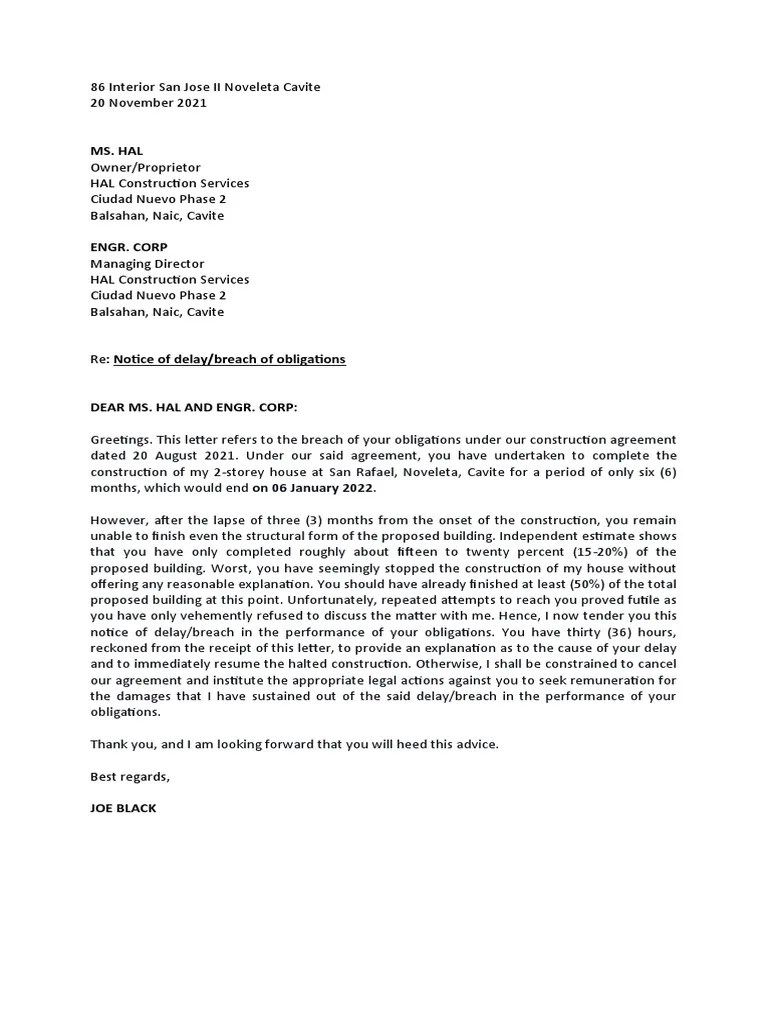 Web this guide provides a detailed approach to writing a “notification of project delay: In reviewing the progress to date for the. Web this article includes key factors required by standard contract form notice provisions, plus 16 sample construction contract notice letters. Web we will continue to keep your project representatives informed of these delays and their effect on overall.