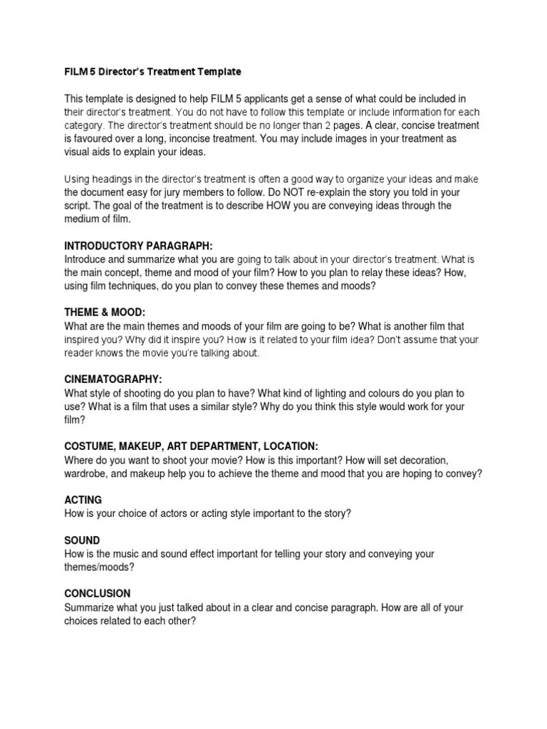 Directors Treatment Template - Web the film treatment template provides the structure you need to evoke the vision of your story. See examples and download a. How to write a film treatment (with examples) start to streamline your writing process with a film script treatment. Web download the free film treatment template and learn from our samples how to write and format a script. Web a director's treatment is a document that outlines a director's vision for a film or video project. Web our director’s treatment template is a comprehensive guide that walks you through the essential components of pre.