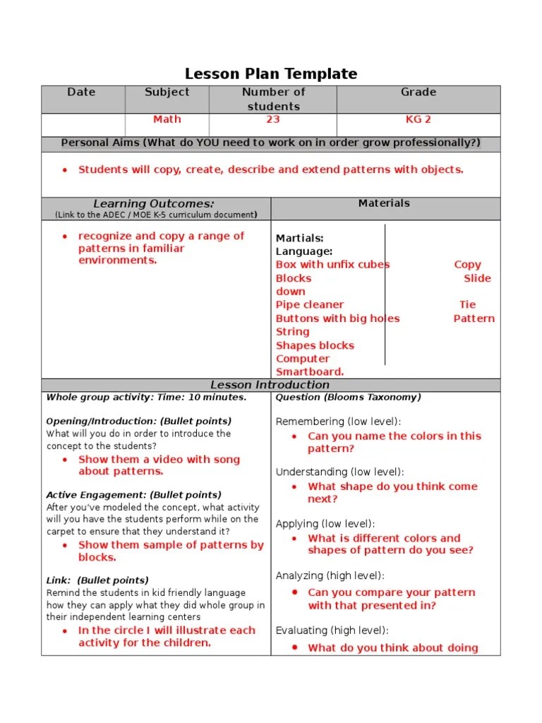 Kindergarten Math Lesson Plan Template
