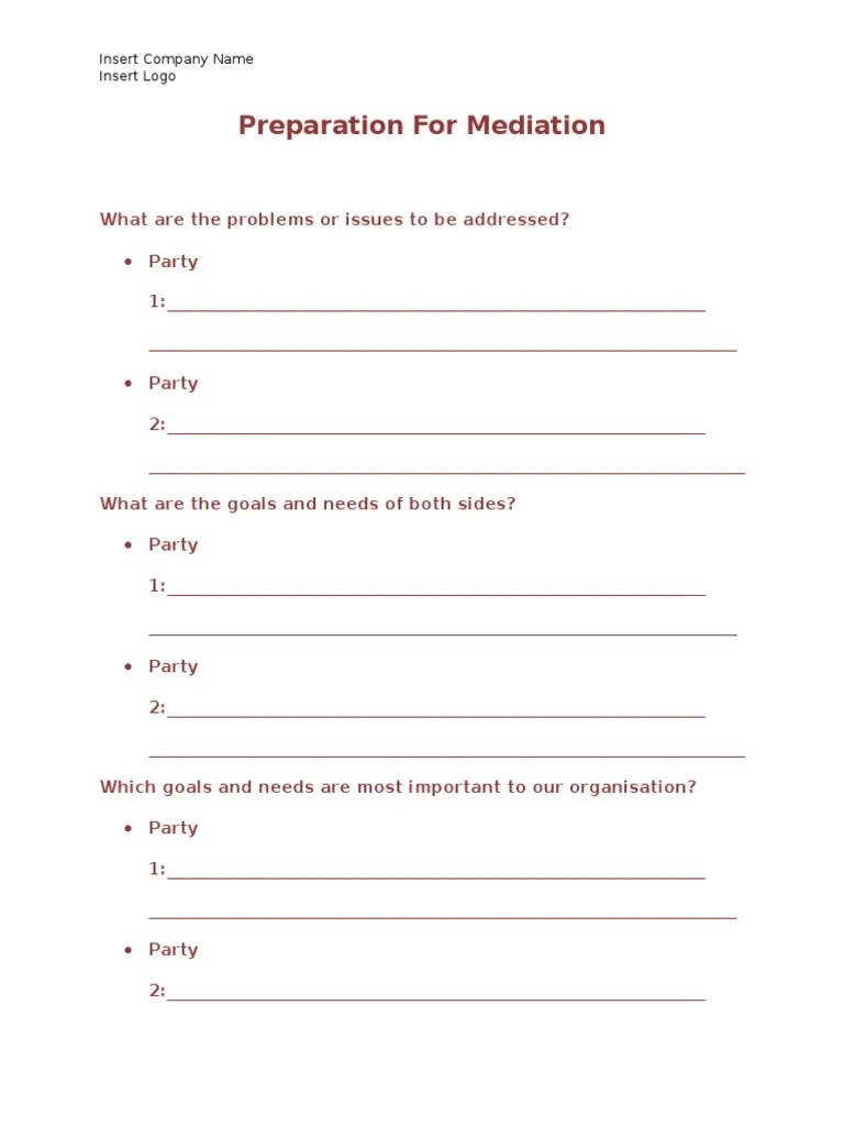 Web checklist for client mediation preparation 1. Web the advocate’s mediation checklist. Web in therapeutic mediation, mediation is a form of communication in which the parties are encouraged to. You will learn that mediation is in the nature of a. Web consider preparation for it as the moral and functional equivalent of preparing for trial.