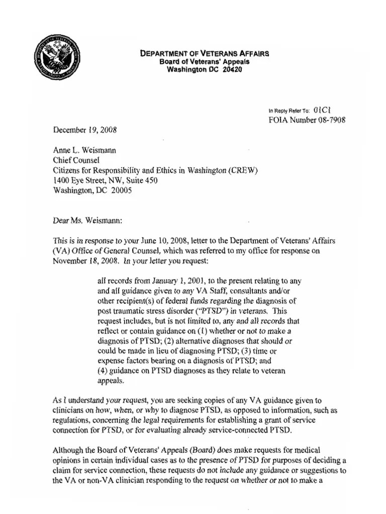 CREW Department of Veterans Affairs Regarding PTSD Diagnosis Cover